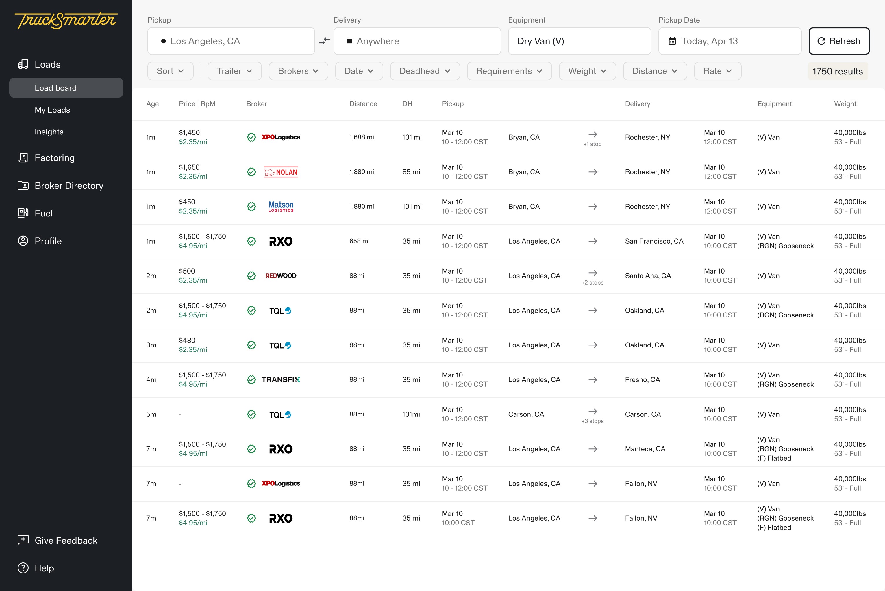 I've been using DAT and Truckstop, but I now look at TruckSmarter app first. It's way more powerful, better brokers that post REAL rates and prices, has more filters, a map for each load, more accurate dates and times for pickip and delivery. Would recommend this to anyone else that books their own loads.